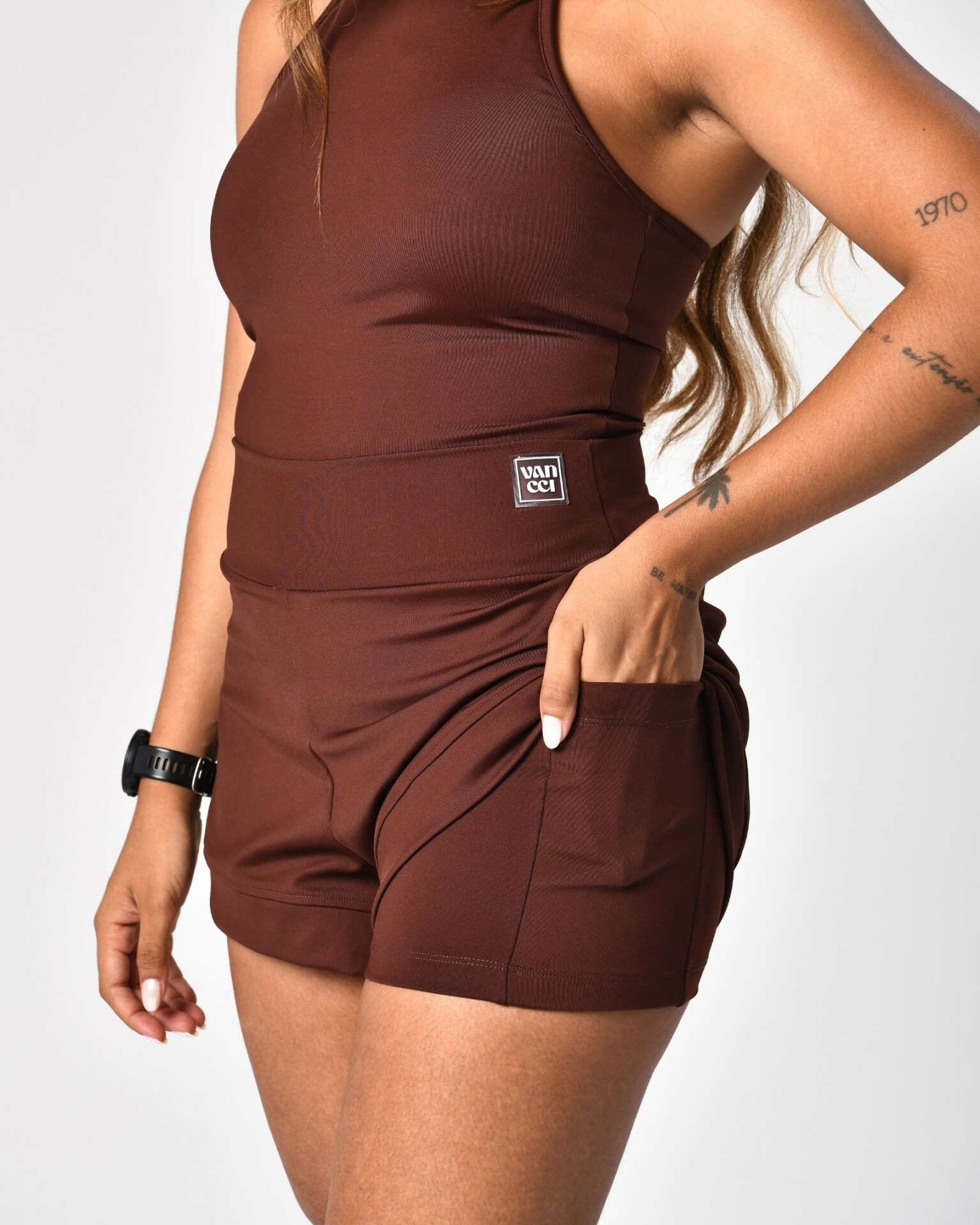 Foi pensado para ser um short confortável, estiloso (ao mesmo tempo muito fofo) e podendo ser usado na prática de vários esportes: corrida, musculação, crossfit, tênis, beach tenis…