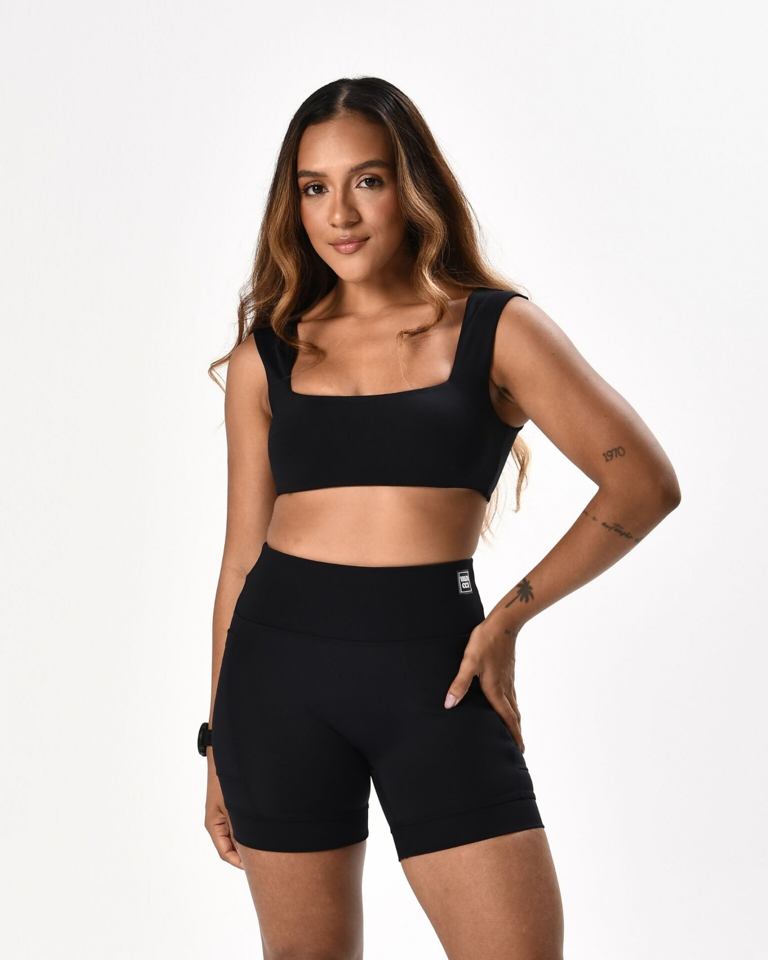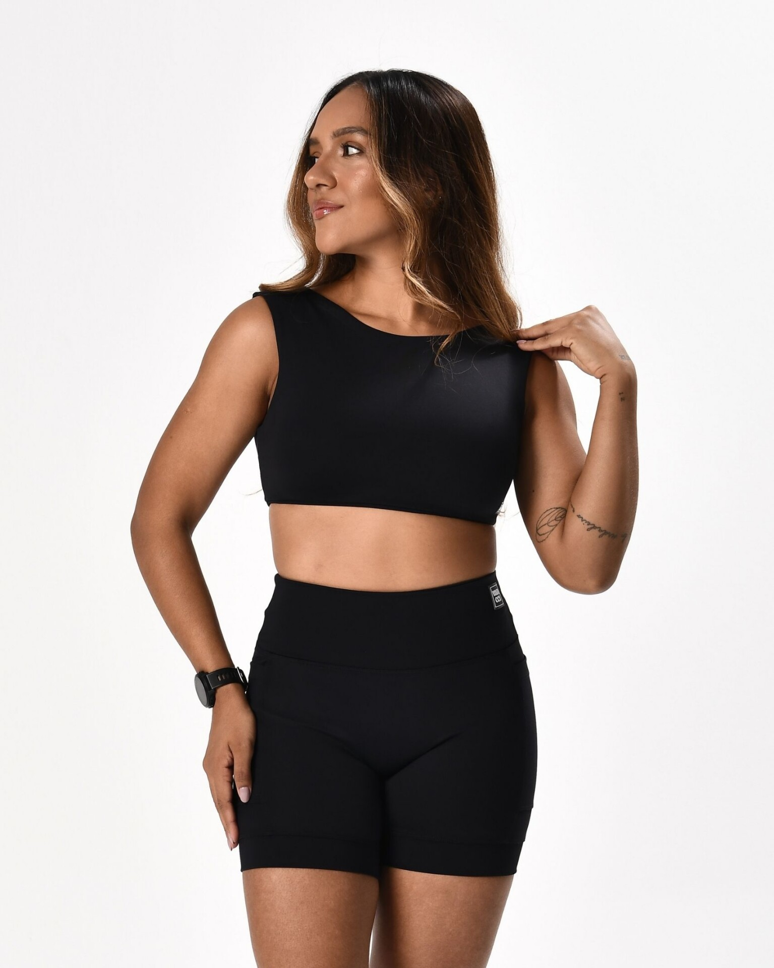 A modelo veste P. | Composição: 85% Poliamida 15% Elastano | Compressão: Alta.